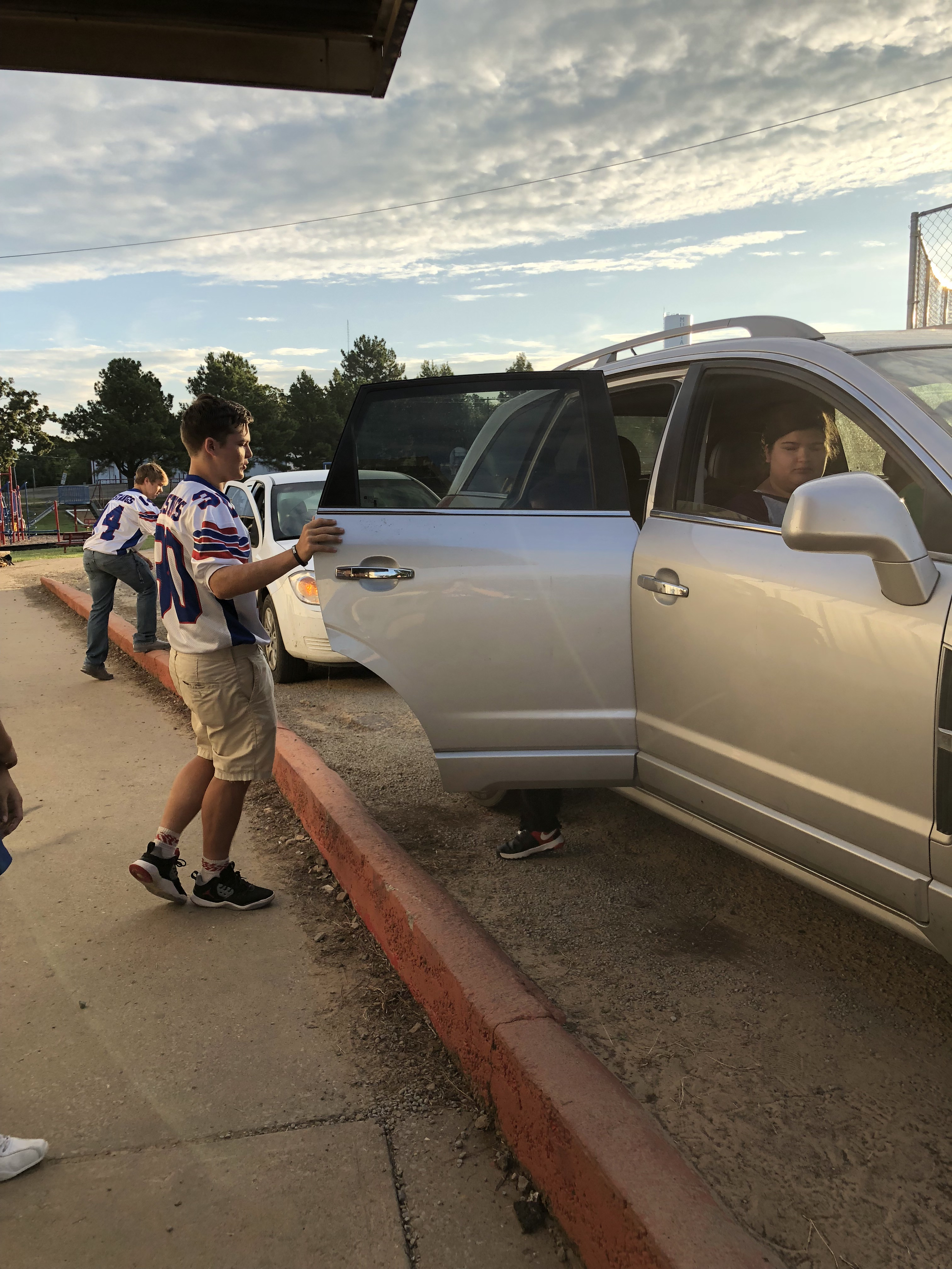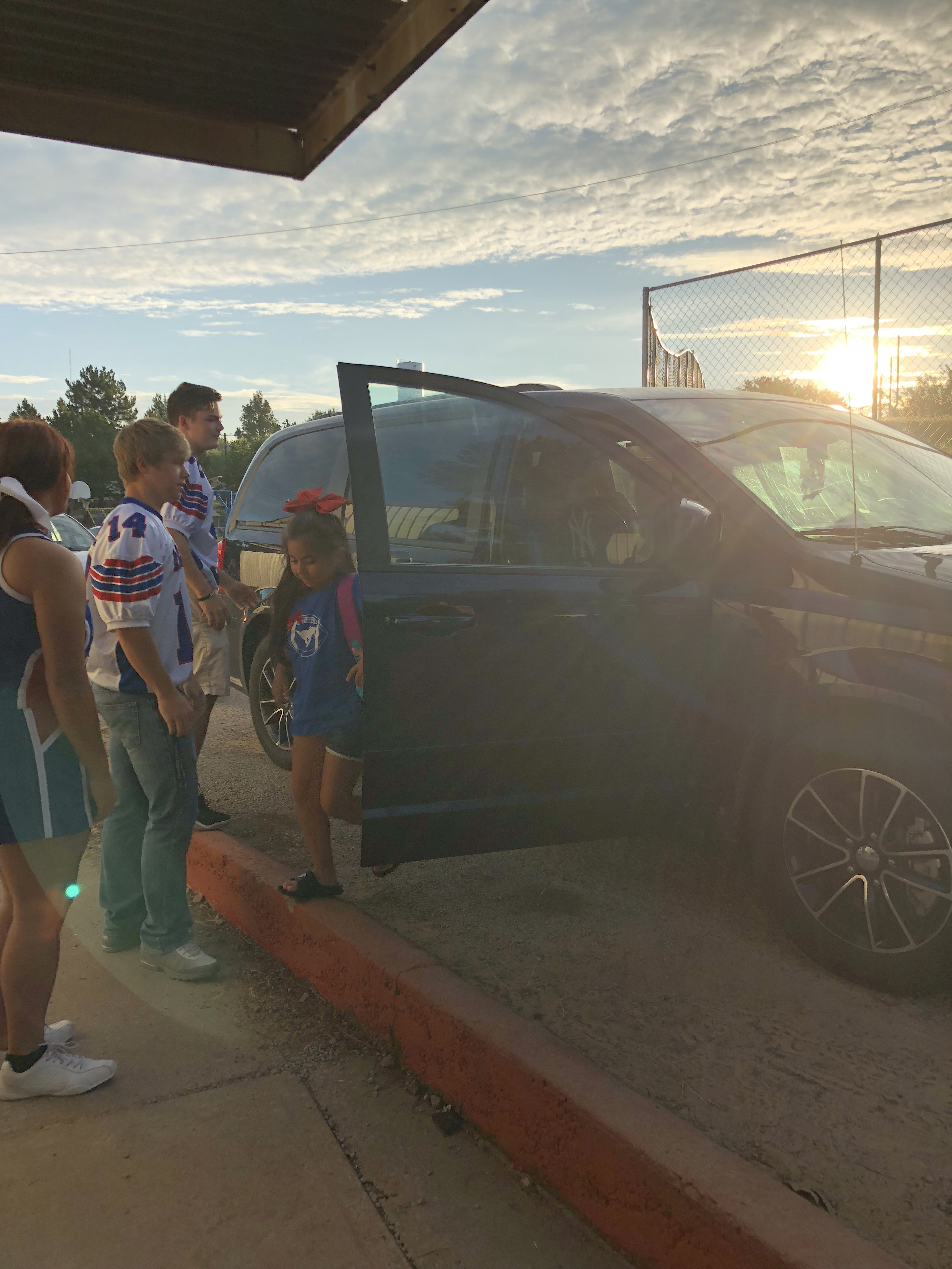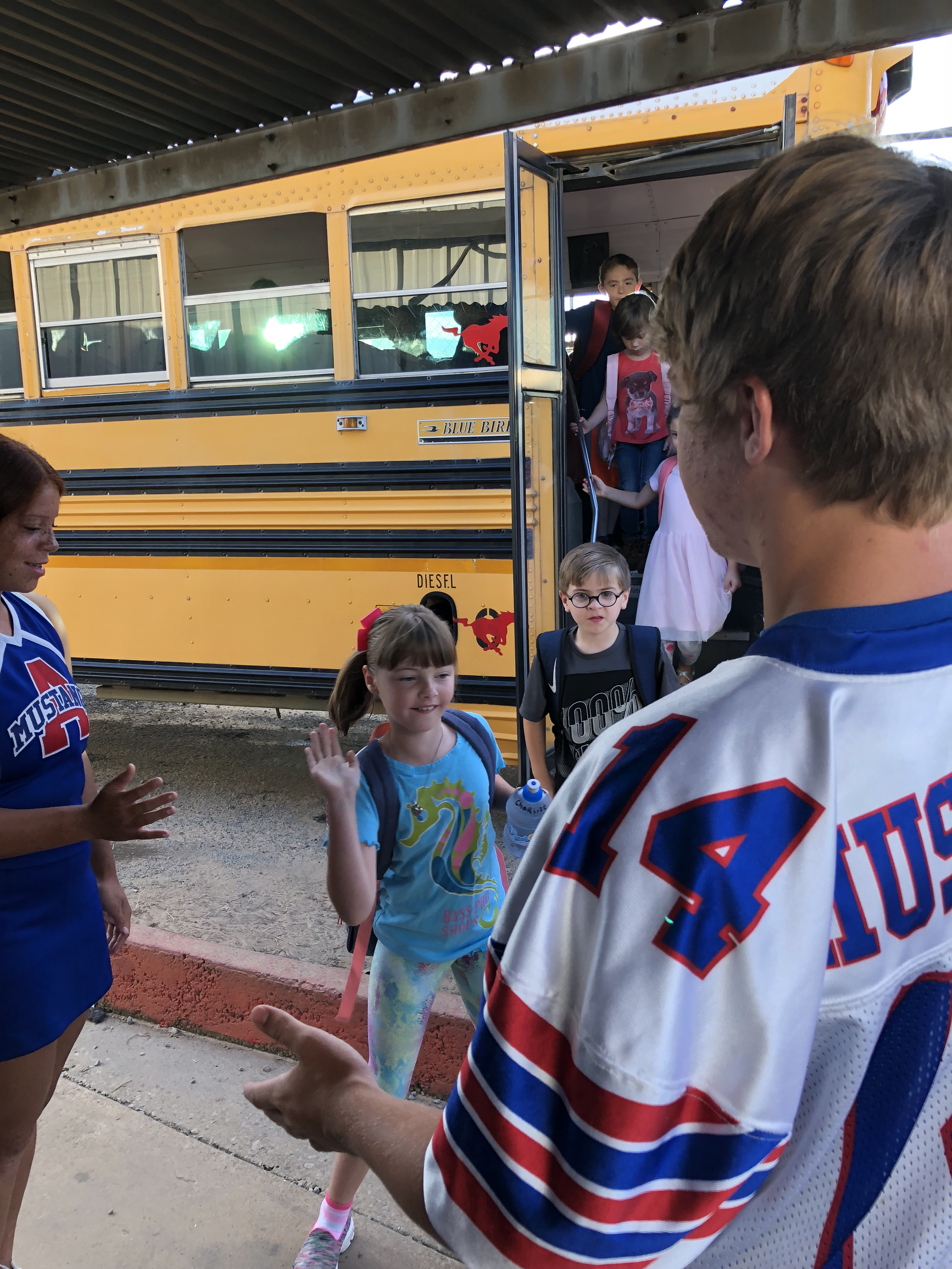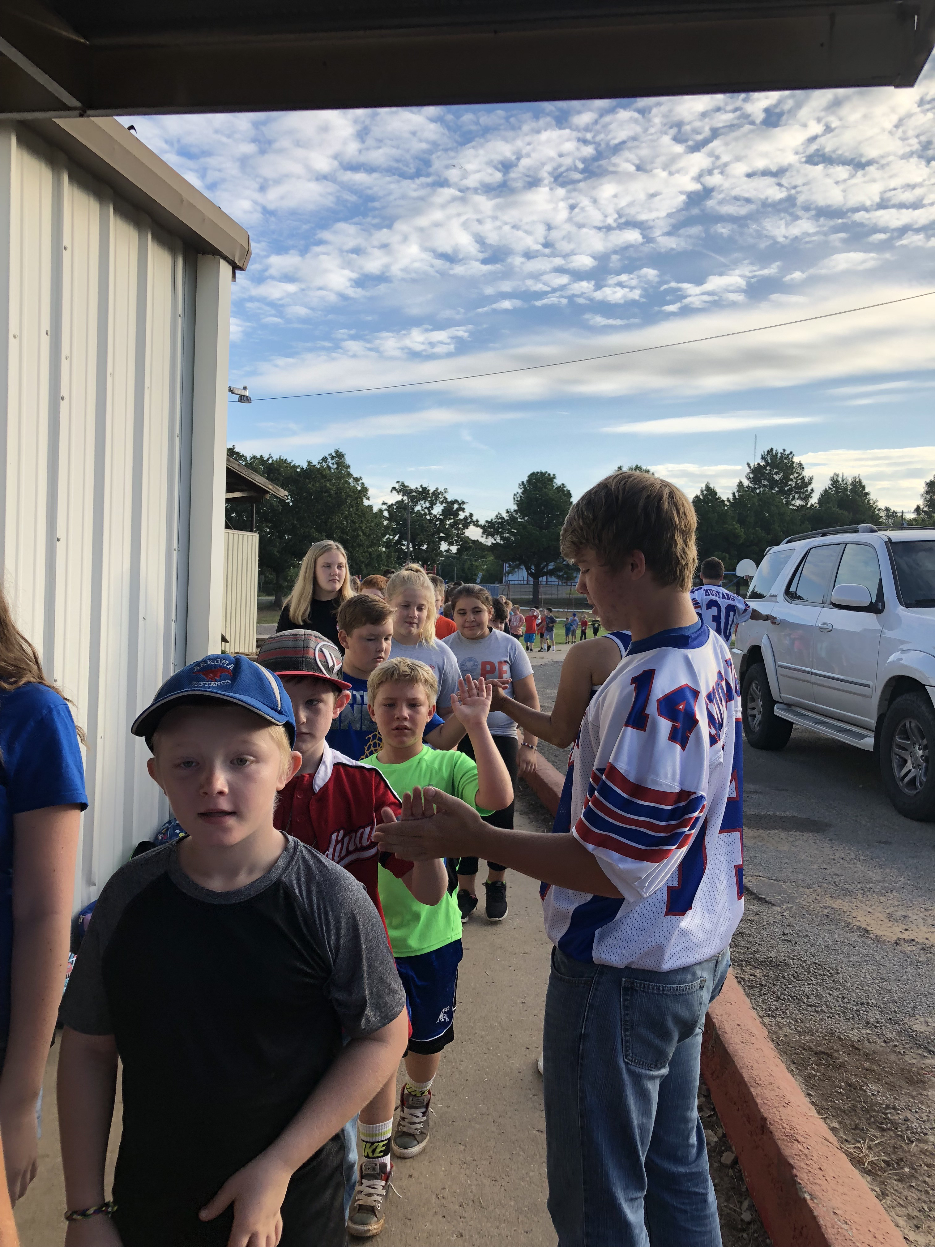 Junior football players and cheerleaders greet students in car rider line
